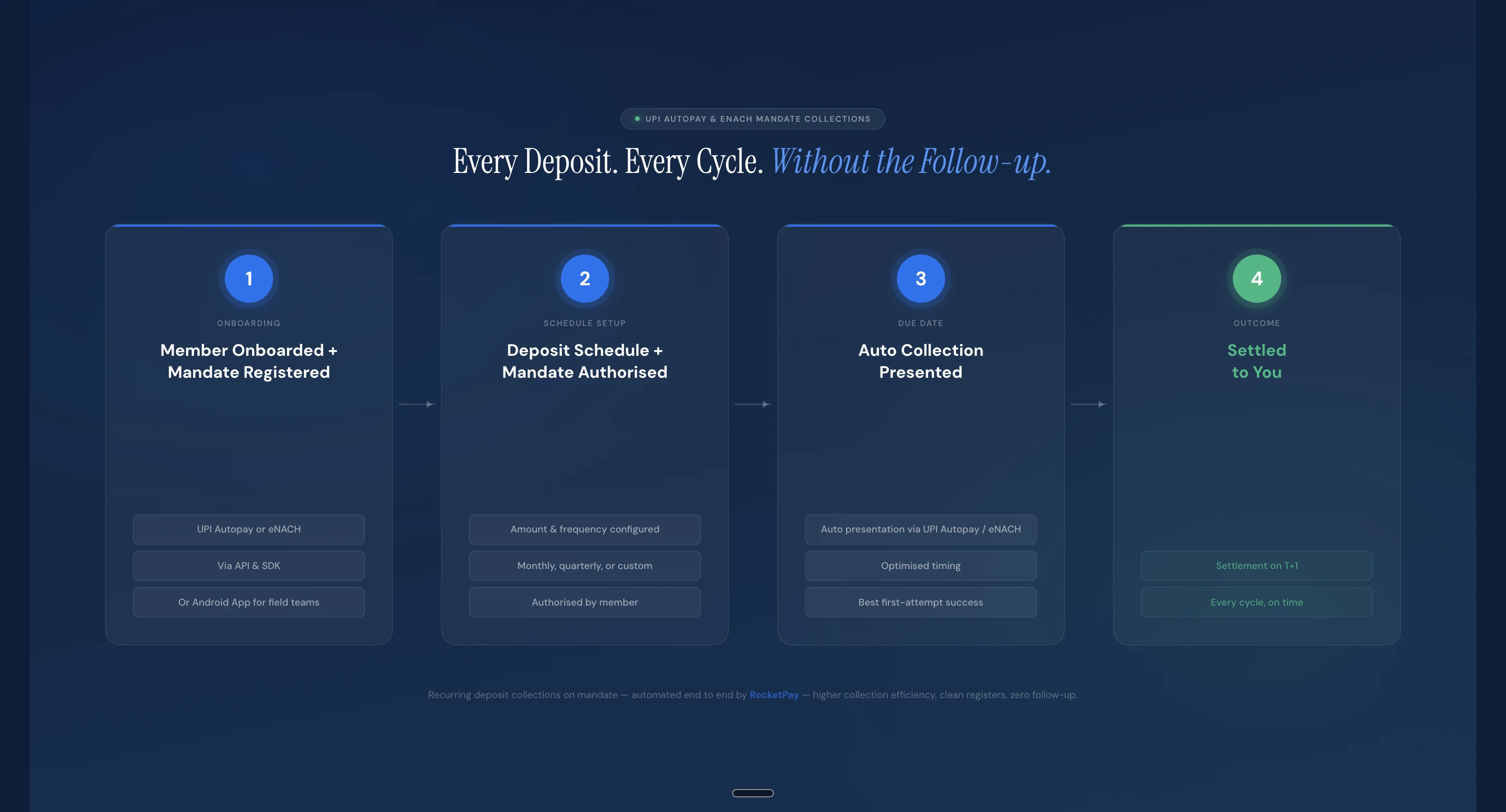 From NBFCs to credit cooperatives — automate recurring deposit collections on mandate.